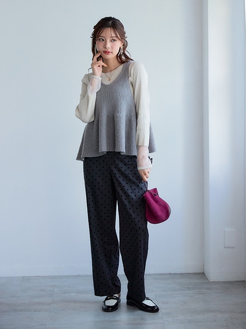 フリルやタックなどデザイン性のあるトップスに濃淡がつく色合いのボトムスを選べば、メリハリのあるコーデになります。