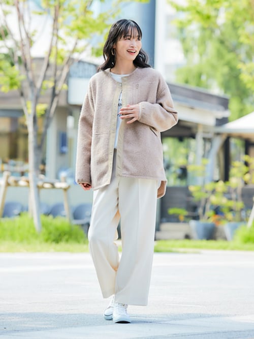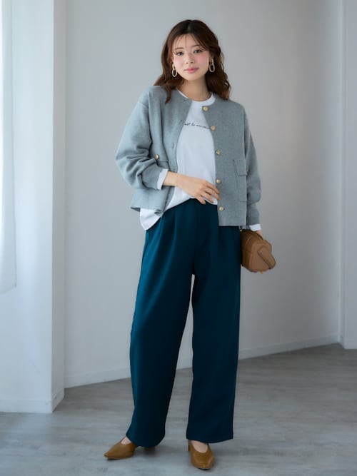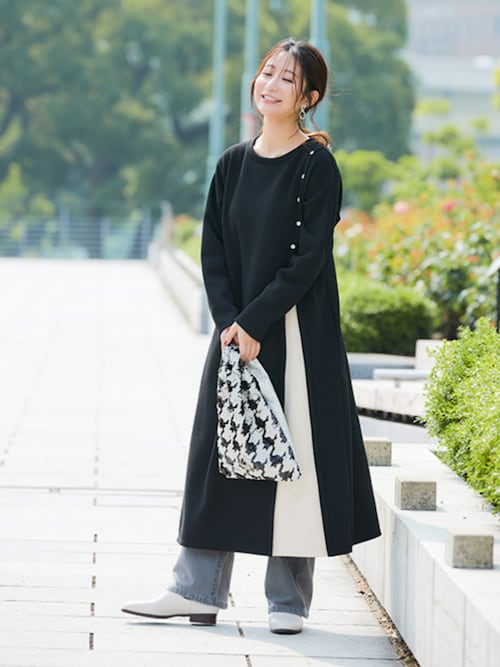 また、ロング丈はヒップ周りの体型カバーになりますが、羽織でやや重めに見えるため、ボトムスはスッキリしたものを選びましょう。