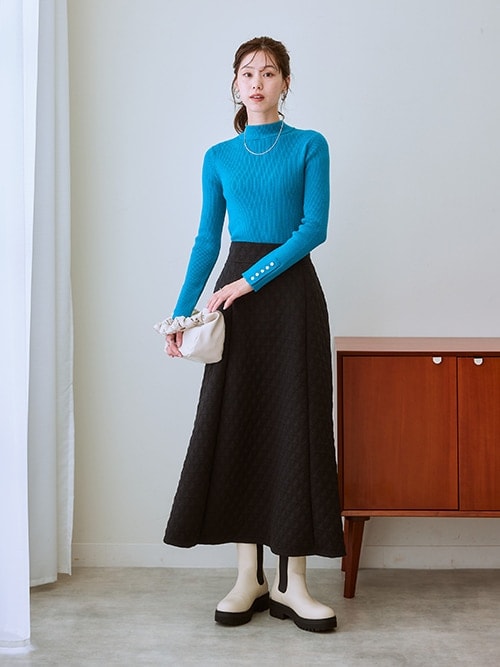 ウエストマークは、上半身の一番細いところを見つけるのがポイント!ベルトや横ラインを入れることで女性らしいボディラインが生まれます。上下で色のメリハリを作るとなお良し。