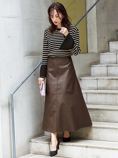 深みのあるブラウンのフェイクレザースカートが季節感と上品さを演出。