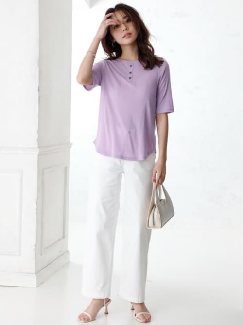 柔らかなラベンダーカラーのヘンリーネックシャツは、ランダムリブで体型カバーを期待できます。