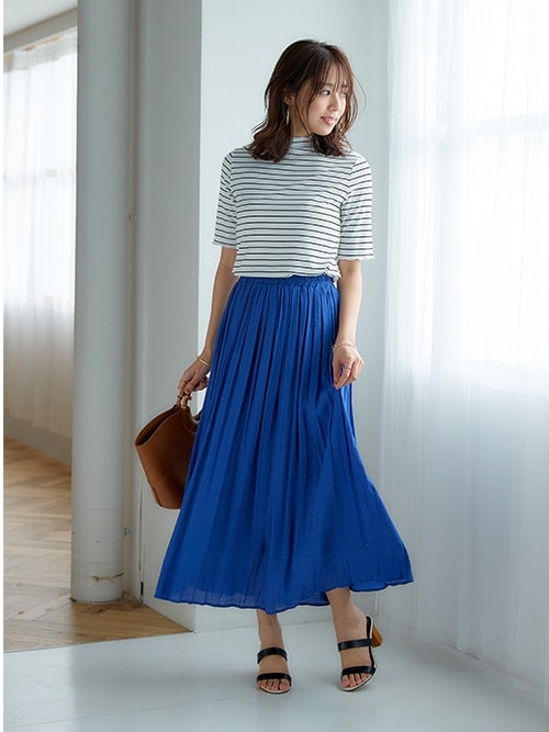 トップのフィットするシルエットで上品な印象を与えつつ、スカートの夏らしいブルーカラーで、可愛らしさと爽やかさを演出してくれます。