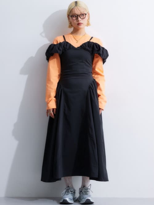 ブラックのオフショルダーワンピースは、バルーンシルエットで、立体感のあるデザインが目を引く主役アイテム。