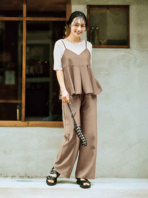 ムシムシした日は、サッと着るだけの楽ちんキャミソールセットアップに、シアー素材のトップスを合わせて、気軽にフェミニンコーデを楽しんでみるのはいかがでしょうか。