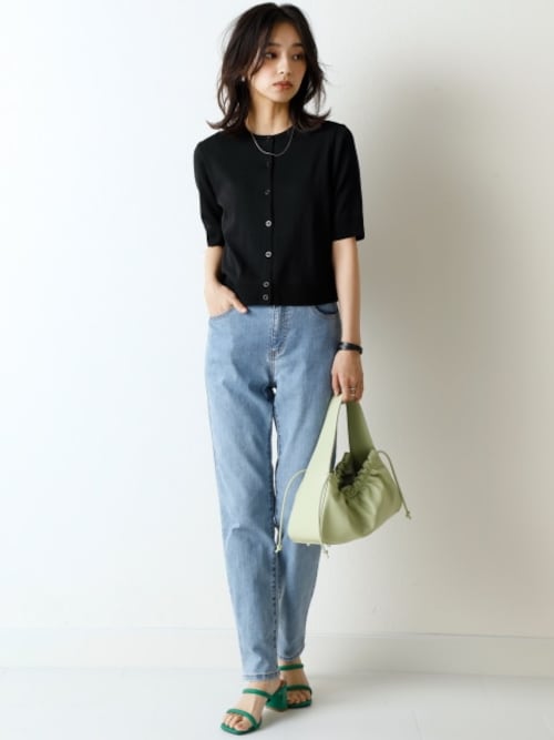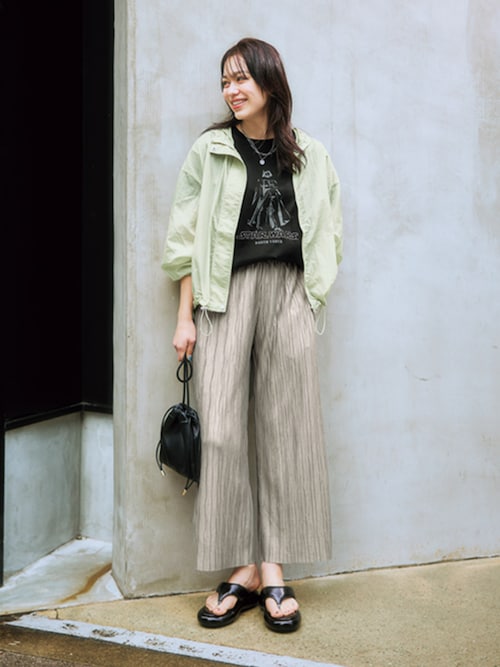 ジャケットの、ふんわり優しいライトグリーンのパステルカラーが、コーディネートに春らしさを生み出します。