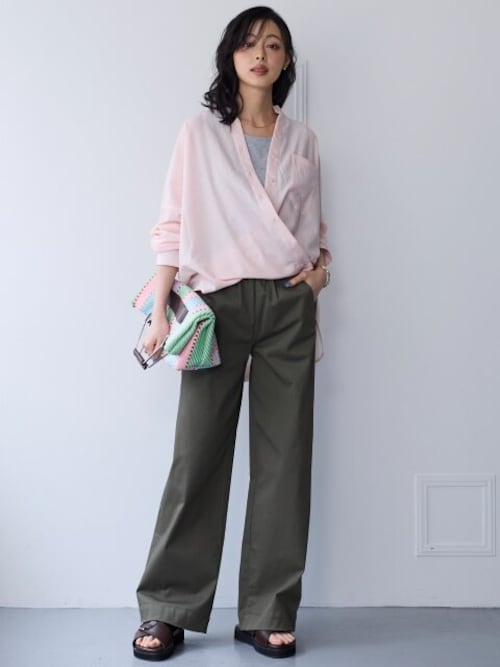 ボトムには、履き心地はゆったりなのに、スッキリ見える上品なワイドパンツを合わせて、リラックスしながら一日を過ごしましょう。