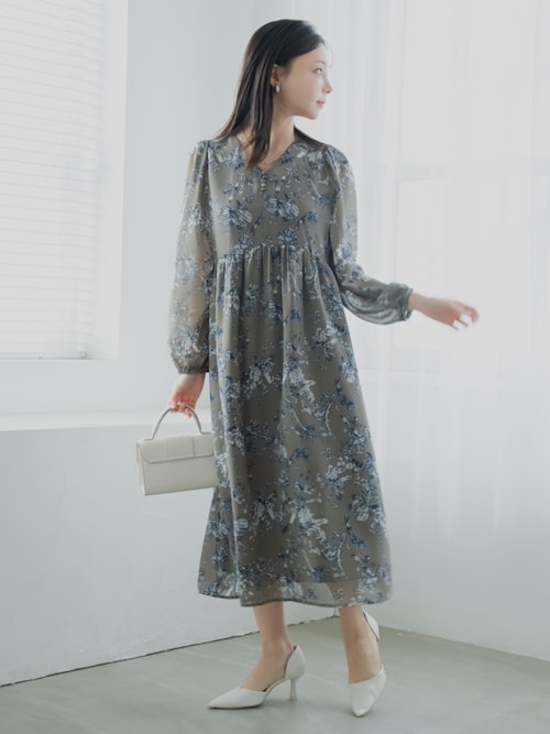 小さいサイズ 花柄シフォンウエスト切替ワンピース(ウォッシャブル素材) 低身長さん・小柄女性